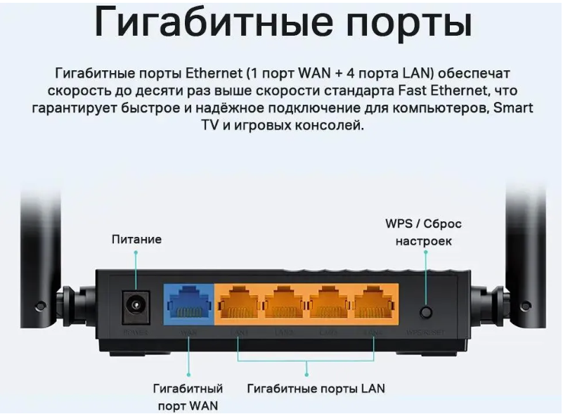 Archer C64 оснащен 4 портами LAN и 1 WAN-портом, что позволяет подключать проводные устройства с высокой скоростью. Гигабитные порты обеспечивают стабильное и надежное соединение для ПК, игровых приставок и смарт-телевизоров, где важна минимальная задержка и высокая пропускная способность. - Универсальность подключения: