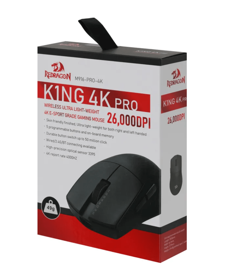 Ультралёгкая игровая мышь Redragon K1ng 4K Pro создана для тех, кто ценит скорость, точность и свободу движений. Благодаря частоте опроса 4000 Гц и мощному сенсору PixArt P3395 устройство мгновенно реагирует на каждое движение — вы получаете преимущество в динамичных играх.