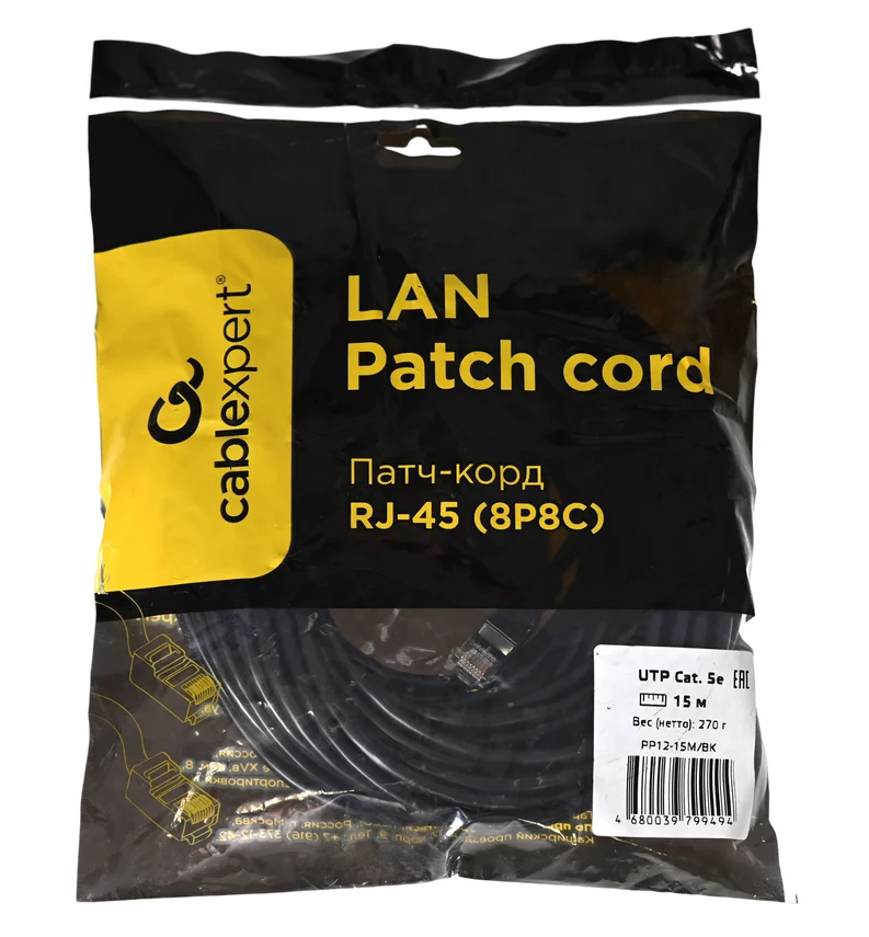 Патч‑корд Cablexpert PP12-15M/BK (UTP, кат. 5e, 15 м, чёрный)