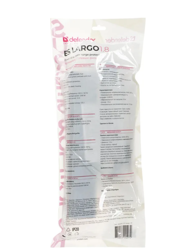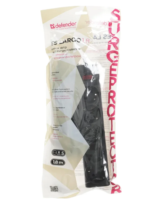 Сетевой фильтр Defender ES largo 1.8 черный, 1,8 м, 5 розеток экономичный вариант решения проблемы защиты электропитания. Предназначен для широкого спектра бытовой и электронной техники, включая чайники и электронагреватели. Сетевой фильтр имеет 5 розеток евростандарт, защищает электронную технику от короткого замыкания, перегрузок по току и импульсных помех. Компактный корпус фильтра выполнен из прочного негорючего пластика, сетевой шнур и контакты розеток из чистой меди.