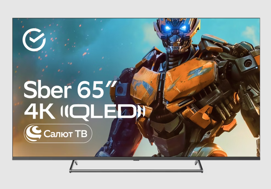 - Умный безрамочный телевизор Sber из новой коллекции на стильном моностенде. Яркий и чёткий UHD-экран с технологией QLED и диагональю 65″. Также есть двухдиапазонный Wi-Fi, улучшенный звук и увеличенная оперативная память.